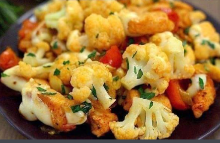 Ingredientes: 400g de coliflor 300g de pechuga de pollo Sal Pimienta negra Pimientos dulces Aceite vegetal 1 cebolla 150g de tomates Queso rallado Perejil Instrucciones: Continua en la siguiente pagina